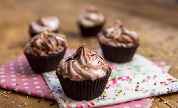 1. Derreta o chocolate e, com a ajuda de um pincel, passe–o por dentro das forminhas de minicupcake. Leve para a geladeira por 5 minutos. Retire da geladeira e passe uma outra camada. Volte por mais 5 min.